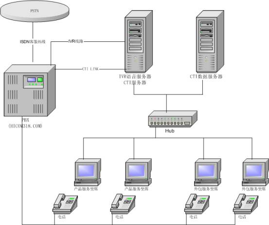 Siemens Hicom318.com交換機(jī):接入ISDN中繼線,設(shè)置人工座席分機(jī),為CTI,IVR語音服務(wù)器提供16路IVR端口和CTI