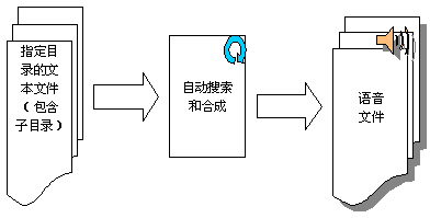 系統(tǒng)功能實(shí)現(xiàn)示意圖如下圖,離線合成系統(tǒng)可以自動(dòng)搜索指定目錄(可包含子目錄)的文本文件,并按指定的規(guī)則生成相應(yīng)的語(yǔ)音文件。