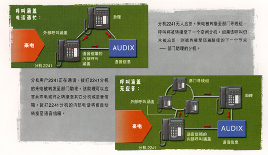 當最初的被叫方不能接聽來話時,呼叫涵蓋功能可將來話轉(zhuǎn)接到另外一個分機。您可以自行規(guī)定判斷是否轉(zhuǎn)接的標準以及涵蓋通道的條件,如無應(yīng)答、 無此號碼、遇忙籌。DEFINITY BCS還可以識別內(nèi)部和外部呼叫,并為其提供不同的涵蓋通道。