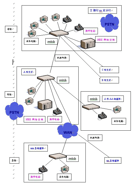 在銀行的省、市級分行分別部署一臺NBX網(wǎng)絡交換機——只需通過接入銀行系統(tǒng)內(nèi)部局域網(wǎng),經(jīng)過簡單的配置即可使用。然后根據(jù)需要,在市內(nèi)各個儲蓄所、各縣級儲蓄所配置相應數(shù)量的數(shù)字話機,那么在全省內(nèi)各個縣市區(qū)的各個營業(yè)網(wǎng)點之間,上下級之間就都可以使用數(shù)字電話機通過數(shù)據(jù)網(wǎng)免費撥打語音電話。
