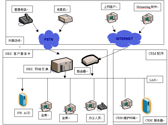NBX客戶服務(wù)中心是基于3Com公司的NBX網(wǎng)絡(luò)電話交換機平臺構(gòu)筑的新一代呼叫中心,首先它擴大了服務(wù)方式,客戶不但可以通過電話得到服務(wù),還可以在上網(wǎng)訪問企業(yè)主頁的同時使用耳機、麥克風(fēng)直接與服務(wù)代理人員(AGENT)語音通話,一邊瀏覽網(wǎng)頁,一邊交談,增加交流的信息輔助量。還可以通過電子郵件、傳真等方式完成與企業(yè)信息交流,其次NBX客戶服務(wù)中心內(nèi)部數(shù)據(jù)、語音兩網(wǎng)合一的布線結(jié)構(gòu),不但提高了呼叫中心的穩(wěn)定性,而且使客戶數(shù)據(jù)能與電話語音同步協(xié)調(diào),完成具有針對性的一對一的客戶服務(wù)。
