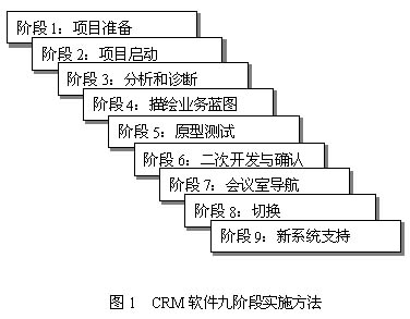 在此,結(jié)合項(xiàng)目管理和管理信息系統(tǒng)實(shí)施的特點(diǎn),本文給出CRM軟件系統(tǒng)九階段的實(shí)施方法。如圖所示