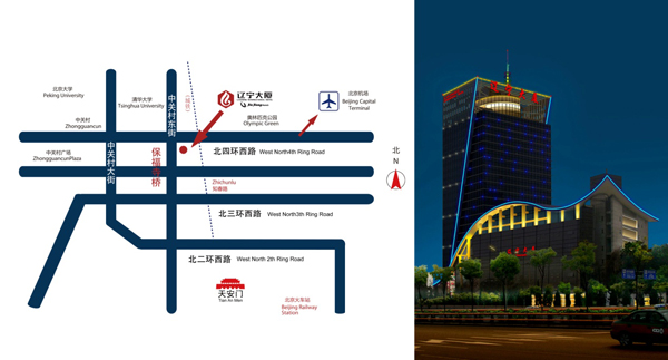 北京遼寧大廈位于北四環(huán)黃金地段,乘坐首都機(jī)場巴士即可到達(dá)。距譽(yù)有"中國硅谷"之稱的中關(guān)村信步可至,毗鄰北大清華,距中外聞名的奧運(yùn)場館"鳥巢"僅5分鐘車程。地理位置得天獨(dú)厚,交通便捷。