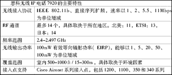隨著思科無線IP電話7920的推出,思科公司為用戶提供了融合式無線解決方案和智能化的無線基礎(chǔ)設(shè)施,以及一款新產(chǎn)品,從而增強(qiáng)了IP通信在企業(yè)中發(fā)揮的作用。思科無線IP電話7920是一款方便易用的IEEE 802.11b無線IP電話,可以與Cisco CallManager和Cisco Aironet 1200、1100、350和340系列Wi-Fi(IEEE 802.11b)接入點(diǎn)配合,提供全面的語音通信功能。作為思科AVVID無線解決方案的一部分,思科無線IP電話7920可以在一個(gè)端到端的思科網(wǎng)絡(luò)中提供無縫的服務(wù),例如安全、移動(dòng)、服務(wù)質(zhì)量(QoS)和管理。