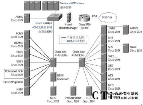 WAN。每所學(xué)校都在布線室中安 裝了一臺(tái)自己的 Cisco Catalyst 3524 或者 2924 交換機(jī),并為每個(gè)桌面提供了 10Mbps