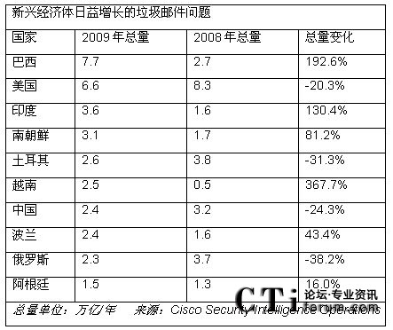 幾個世界經(jīng)濟(jì)領(lǐng)先的國家在2008年和2009年間垃圾郵件量有所降低;然而,發(fā)展中國家的垃圾郵件量呈現(xiàn)上升趨勢。