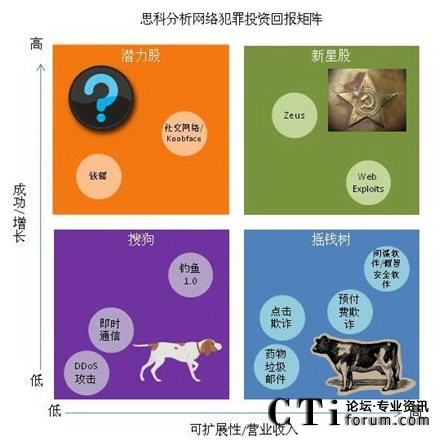 思科網(wǎng)絡(luò)犯罪投資回報(CROI)矩陣:今年的《年度安全報告》首次推出了思科CROI矩陣,以波士頓咨詢集團(tuán)著名的“增長-份額矩陣”為基礎(chǔ)。CROI分析了2010年何種類型的網(wǎng)絡(luò)犯罪將為成為“成功者”以及“失敗者”。該矩陣根據(jù)2009年的表現(xiàn),預(yù)測大量的銀行業(yè)Trojan