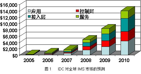 IMS作為一個通信架構(gòu),開創(chuàng)了全新的電信商業(yè)模式,拓展了整個信息產(chǎn)業(yè)的市場空間。IMS正在成為新一輪的投資熱點。IDC認(rèn)為,IMS市場將從目前的數(shù)百萬美元迅速增長到2010年的141億美元(如圖1)。對于電信行業(yè)來說,IMS的意義甚至超出了3G或4G,它將重新定義未來的通信業(yè)務(wù)。