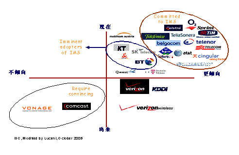 朗訊IMS融合解決方案的優(yōu)勢決定了其市場的領(lǐng)導(dǎo)地位,截至2006年24月,朗訊在全球已簽約77個IMS商用合同和77個試驗合同。尤其是北美五大運營商(Cingular、Sprint、at&t、BellSouth、Verizon)中有4個已經(jīng)與朗訊簽訂了IMS