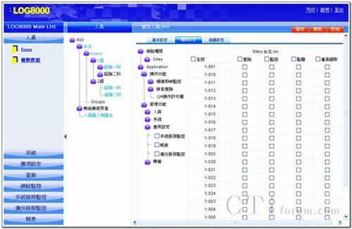 權限管理設計,采樹枝狀展開圖之設計模式,讓系統(tǒng)管理者可以輕易地掌握目前建立組織(各個據點)、人員(為值機員、督導、評分員或管理者)與不同群組之狀態(tài),設定多層級的權限密碼,增加維護便利性。