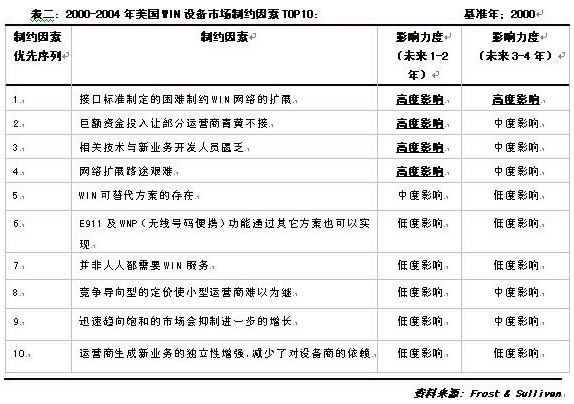 美國(guó)的WIN市場(chǎng)盡管處于強(qiáng)勢(shì)發(fā)展過(guò)程中,但這其中的變數(shù)也是有的。根據(jù)Frost & Sullivan 資料,2000-2004年間制約該市場(chǎng)發(fā)展的主要因素與影響力度見(jiàn)表二: