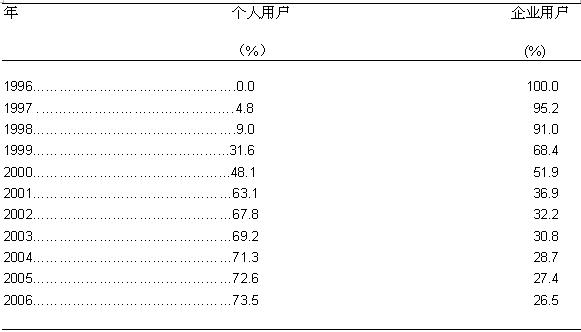 圖三表示出美國DSL市場企業(yè)和個人用戶所占的比例。在1999年以前,企業(yè)用戶占了這個市場的絕大部分,這一時期服務(wù)商提供的主要是針對企業(yè)用戶的HDSL服務(wù)。而從1999年以后隨著ADSL技術(shù)的成熟和普及,個人用戶正在成為市場上的主力軍。1999年,個人DSL用戶僅占總用戶數(shù)的31.6%, 企業(yè)用戶,主要是中小企業(yè)用戶占DSL總用戶數(shù)的68.4%。而到了2000年,美國市場上48.1%的DSL用戶為家庭用戶,企業(yè)用戶的比例下降為51.9%。Frost & Sullivan預(yù)測,到2006年,73.5%的DSL用戶將是個人家庭用戶,企業(yè)用戶將僅為26.5%。