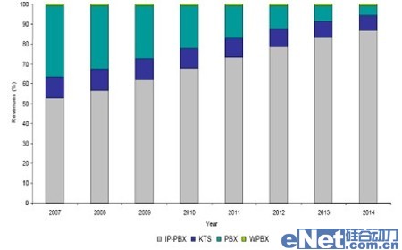 隨著中國經(jīng)濟(jì)的高速發(fā)展,企業(yè)通信市場也將保持一定的發(fā)展速度。Frost & Sullivan數(shù)據(jù)顯示,從2007年到2014年,國內(nèi)企業(yè)通信市場年均復(fù)合增長率為5.9%,到2014年市場規(guī)模約為4.82億美元。其中,企業(yè)IP通信市場將保持高速發(fā)展態(tài)勢,年均復(fù)合增長率將達(dá)到13.7%,市場規(guī)模將從2007年的1.71億美元增長到2014年的4.19億美元。屆時,IP通信將擁有整個企業(yè)通信市場86.9%的市場份額。傳統(tǒng)的PBX及KTS市場將持續(xù)萎縮。