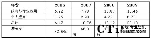 如圖1所示,F(xiàn)rost & Sullivan認(rèn)為,由于個(gè)人應(yīng)用領(lǐng)域的商業(yè)模式還未成熟,產(chǎn)業(yè)鏈整合仍在進(jìn)行中,目前移動(dòng)位置服務(wù)應(yīng)用仍然以政府和企業(yè)應(yīng)用為主。如圖4所示,2009年個(gè)人應(yīng)用市場(chǎng)規(guī)模為6.73億元,而政府與行業(yè)應(yīng)用市場(chǎng)達(dá)到16.45億元,兩者總計(jì)達(dá)23.18億元,同比去年增長了53.3%。