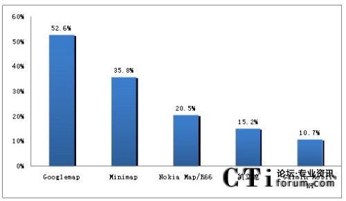 如圖1所示,在用戶占有方面,使用率最高的是谷歌的Googlemap,總計(jì)有52.6%的用戶使用該軟件;其次是高德的迷你地圖,使用率達(dá)35.8%,排名第二;Nokia