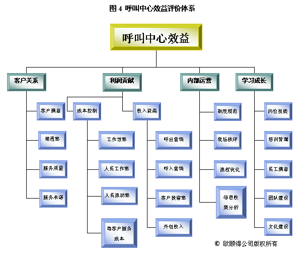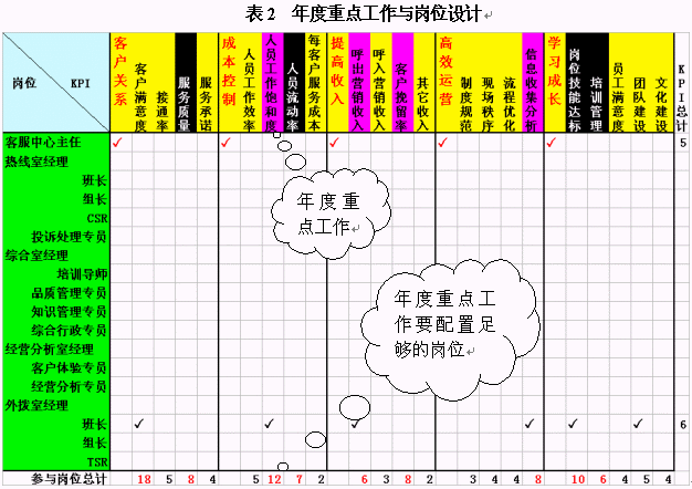 在這里,我們先以崗位設計來舉例。經(jīng)常有呼叫中心主管把每個崗位的職責都設計的非常詳細,包括了每天來做什么,說什么,錄入什么,甚至是打掃某區(qū)域衛(wèi)生之類。但是,我看遍了每一條,也沒找到這個崗位應該對什么業(yè)績"負責任",該對哪些工作做出貢獻。此處建議各位把效益評價體系、年度重點工作與崗位設計結合起來。如表2所示,我們可以把效益評價體系作為KPI放在橫坐標中,而崗位設置則是縱坐標。每個崗位對應的行中,可以勾畫其應負責或者做出主要貢獻的項目。這些項目不能超過6個,因為太多的項目會使得這個崗位無所適從,最終的結果是哪個也沒做好。當你勾畫完成之后,請計算每列的"對勾"數(shù)目,看看你本年度的重點工作是不是有較多崗位負責呢?