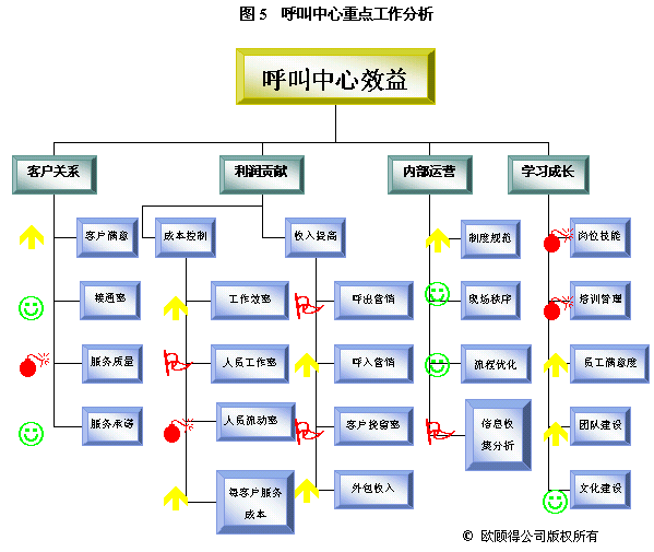 根據(jù)年度重點工作及目標,我們就可以設計關鍵措施來使其實現(xiàn)。通常一項關鍵措施可以有助于幾個目標的達成。如建立培訓體系,可以使得在崗培訓、上崗培訓、多技能訓練以及崗位技能達標率有所提升,而體現(xiàn)在業(yè)務上的效果則是服務質量的提升、呼出營銷收入增加和客戶挽留率提高。