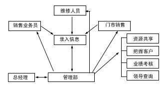 根據(jù)英普的業(yè)務(wù)管理模式,公司將門市銷售、維修部、大客戶部的業(yè)務(wù)管理工作,交由管理部全部管理和協(xié)調(diào),這三個(gè)部門將各自與客戶接待、交往過(guò)程、工作計(jì)劃全部明細(xì)記錄,交由管理部確認(rèn),管理部在保證必要保密的情況下,進(jìn)行工作再分配,同時(shí)加強(qiáng)業(yè)務(wù)考核和其他管理職能工作。其業(yè)務(wù)流程如圖1。