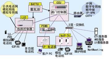 圖1顯示了一個(gè)IPstage系統(tǒng)的基本結(jié)構(gòu),IP PBX系統(tǒng)包含了通信控制器(CCU)、線(xiàn)路控制器(LU32)、以太網(wǎng)電話(huà)IP-TEL、連接普通電話(huà)的VoIP-TA適配器、后備電池,以及可直接連接PHS基站系統(tǒng)。通信控制器是IP