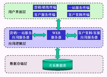 數(shù)據(jù)存儲(chǔ)層中以關(guān)系模型存儲(chǔ)了營(yíng)銷管理、一站服務(wù)、客戶檔案與客戶服務(wù)功能模塊所需的客戶、業(yè)務(wù)數(shù)據(jù);應(yīng)用邏輯層的WEB服務(wù)器向用戶界面層的瀏覽器提供WEB訪問服務(wù),應(yīng)用服務(wù)器上的程序完成實(shí)際的業(yè)務(wù)邏輯,并將需向前臺(tái)返回的結(jié)果從數(shù)據(jù)庫(kù)中取出,交給WEB服務(wù)器;而前端的用戶界面層負(fù)責(zé)向用戶展現(xiàn)最終的處理結(jié)果。