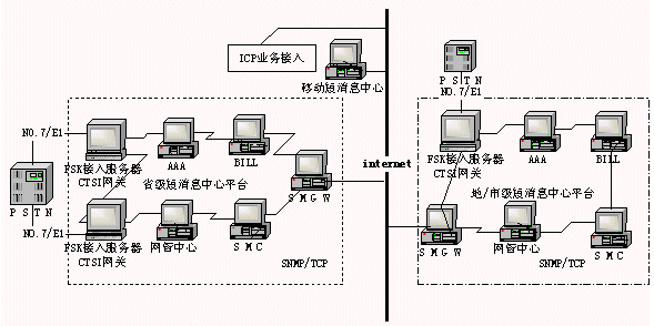 全國短消息統(tǒng)一平臺是在省局短消息中心上架構,各省局下設地/市局短消息中心。各地短消息中心通過INTERNET連接,交互信息,ICP業(yè)務商和其他業(yè)務平臺也通過INTERNET接入短消息系統(tǒng)。根據(jù)《基于電話網的信息終端及綜合平臺技術規(guī)范》中的CTSI (Chinese Terminal Service Interface)協(xié)議,短消息系統(tǒng)系統(tǒng)結構可如下圖所示: