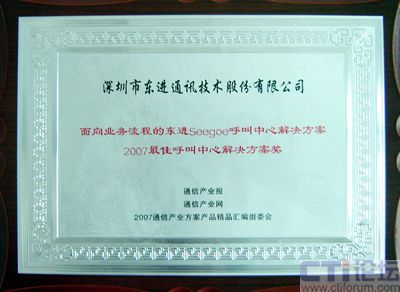 10月23日,中國國際通信設(shè)備技術(shù)展覽會國際通信展覽會開幕當天,由通訊產(chǎn)業(yè)報社主辦的2007通信產(chǎn)業(yè)方案產(chǎn)品精品評選活動頒獎典禮隆重舉行,東進技術(shù)的“面向業(yè)務流程的東進Seegoe呼叫中心解決方案”榮獲2007最佳呼叫中心解決方案獎。