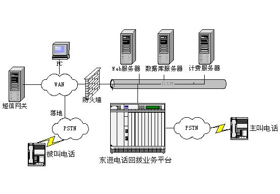 東進(jìn)電話回?fù)芟到y(tǒng)由東進(jìn)電話回?fù)芷脚_、數(shù)據(jù)庫服務(wù)器、Web服務(wù)器和計費服務(wù)器組成。虛擬運營商在基礎(chǔ)運營商那租用模擬或數(shù)字中繼電話線路連接到東進(jìn)電話回?fù)芷脚_,回?fù)苤鹘杏脩羰褂肞STN線路,撥被叫用戶使用寬帶IP寬帶網(wǎng)絡(luò),虛擬運營商需要尋找落地資源,通過互聯(lián)網(wǎng)可以很容易得到。
