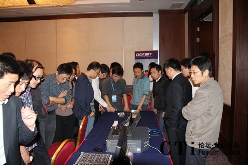 茶歇時(shí)間,嘉賓迫不及待走到東進(jìn)keygoe產(chǎn)品演示臺(tái)參觀,并與東進(jìn)工程師從技術(shù)、產(chǎn)品和應(yīng)用方面熱烈交流,尤其是對(duì)東進(jìn)帶來(lái)的兩套演示系統(tǒng)興趣濃厚,都有親密接觸一把的興致。