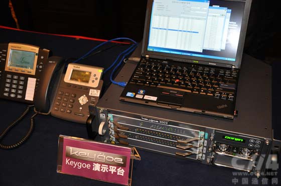 現(xiàn)場兩套演示系統(tǒng)中,一套以Keygoe 3000系列機(jī)箱承載最新研發(fā)的高密度VoIP資源處理板PFBT480X,實現(xiàn)整機(jī)最大1920路VoIP語音處理,展示了keygoe 3000多媒體交換機(jī)在大容量IP呼叫和語音處理的卓越性能。另一套則展示了最新的Keygoe1001系列多媒體交換機(jī),該機(jī)通過內(nèi)置主控CPU板,將語音交換、語音處理以及應(yīng)用程序整合在一個高為1U的物理機(jī)箱中,為中小型規(guī)模業(yè)務(wù)應(yīng)用提供具有較強綜合性、靈活性和完整性的運營平臺。
