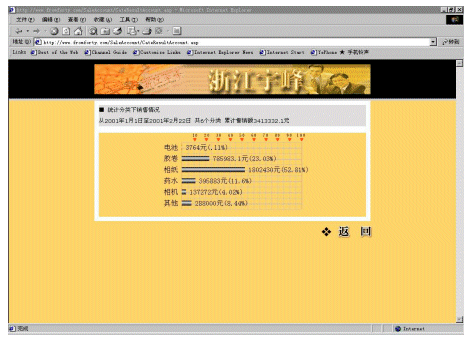 宇峰公司(www.fromforty.com)是柯達(dá)(中國)有限公司在中國華東地區(qū)的總代理,負(fù)責(zé)管理華東地區(qū)近600個(gè)分銷商和連鎖店。公司非常重視信息化建設(shè),添設(shè)了大量的計(jì)算機(jī),建立起初步的管理系統(tǒng)。但是直到2000年還是依靠E-mail傳遞大量的Excel表格獲取需要的產(chǎn)品銷售和庫存的信息。這些表格對(duì)各級(jí)分銷商查詢和統(tǒng)計(jì)數(shù)據(jù)來說非常麻煩,因?yàn)槊恐芤幚韼装賯(gè)訂購單。整個(gè)處理過程非常緩慢,并且成本很高,也容易造成各種的數(shù)據(jù)錯(cuò)誤。而公司內(nèi)部對(duì)業(yè)務(wù)人員銷售情況的統(tǒng)計(jì),也頗為麻煩,因?yàn)橄录?jí)分銷商上報(bào)上來的數(shù)據(jù)準(zhǔn)確性差,并且不夠及時(shí)。處理這些表格對(duì)宇峰公司和分銷商以及連鎖店而言都是效率很低的,并且常常令人茫然不知所措。