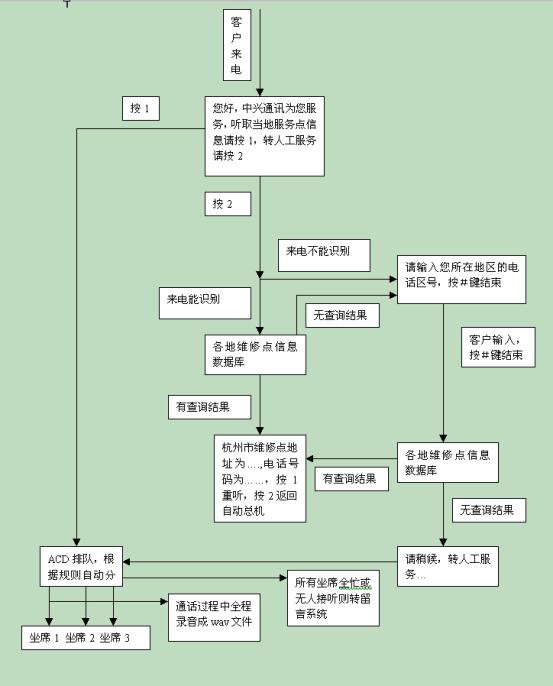 在中興通訊呼叫中心流程設計上充分體現(xiàn)了CTI技術以及數(shù)據(jù)庫技術等IT技術與星際先進的管理理念的融合。該流程的設計保證將主動提高服務品質(zhì)的工作集中于對呼叫者最重要的環(huán)節(jié)――對維修網(wǎng)點信息的咨詢上。它為所有呼叫者提供了詳細、精煉、基本的高品質(zhì)電話服務,同時又根據(jù)電話區(qū)號提供了有針對性的咨詢服務。