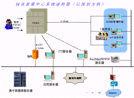 第一階段完成對廣州、深圳、上海和北京四地的客戶服務中心內(nèi)所有系統(tǒng)的設計、開發(fā)、實施和對潤訊相關(guān)人員進行外包業(yè)務的咨詢顧問工作。第二階段完成對其在國內(nèi)其它27個城市的客戶服務中心的建設。