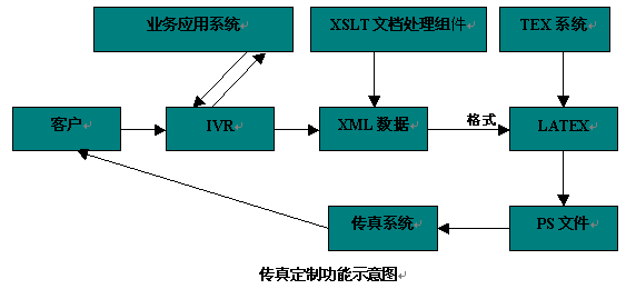 用戶通過(guò)IVR與業(yè)務(wù)應(yīng)用系統(tǒng)交互,獲得所需的傳真數(shù)據(jù),這些傳真數(shù)據(jù)在系統(tǒng)中以XML數(shù)據(jù)的格式存在,系統(tǒng)然后調(diào)用XSLT(英文縮寫(xiě),XSLT是語(yǔ)言,專門(mén)處理XML數(shù)據(jù),通過(guò)一段XSLT程序可以將XML數(shù)據(jù)轉(zhuǎn)換成其他的形式的文檔,如HTML,LATEX文檔,從而用來(lái)顯示XML數(shù)據(jù)給人們閱讀)文檔處理組件對(duì)XML數(shù)據(jù)處理,處理結(jié)果是LATEX(LATEX是TEX系統(tǒng)增加了一些宏指令的增強(qiáng),TEX系統(tǒng)是一個(gè)計(jì)算機(jī)排版系統(tǒng),