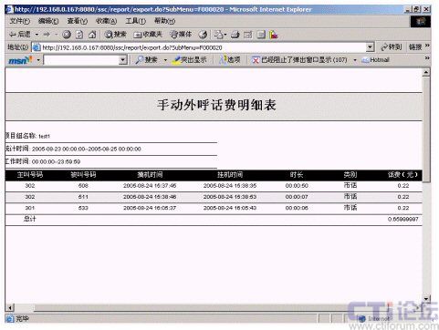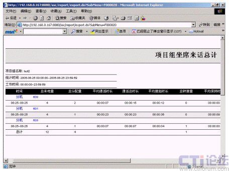 2.項目組外撥分析:包括手動外呼話費明細表、手動外呼話費總計表、項目組手動外呼日報告、項目組自動外呼日報告、項目組座席外撥總計、自動外呼話費明細表、自動外呼話費總計表、座席外呼日報告等。該統(tǒng)計報表分別提供了針對手動和自動的外撥話務(wù)、話費統(tǒng)計,分類明確,統(tǒng)計方便。