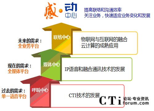 這是“感•動(dòng)中心”的主旨,完全以客戶的業(yè)務(wù)為出發(fā)點(diǎn),體現(xiàn)“以客戶為中心”的理念。而“全景中心”、“聯(lián)絡(luò)中心”等以純技術(shù)為中心,還停留在多媒體通訊和UC通訊手段融合層面,只是新增加了一些新方式的接入等技術(shù),對于客戶業(yè)務(wù)的融合和適應(yīng),并沒有任何提升。