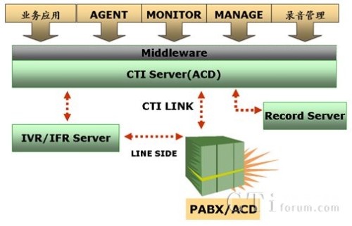 聯(lián)絡(luò)中心主要由電話呼叫分配(PBX/ACD)、計(jì)算機(jī)電話集成(CTI)、交互式語音應(yīng)答(IVR)、實(shí)時錄音和自動外撥等組成,逐漸形成了一個復(fù)雜的多系統(tǒng)異構(gòu)平臺。