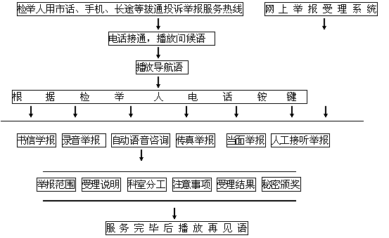 導(dǎo)航語(yǔ):咨詢有關(guān)投訴舉報(bào)受理范圍請(qǐng)按1,咨詢有關(guān)受理說(shuō)明請(qǐng)按2,咨詢科室分工請(qǐng)按3,咨詢投訴舉報(bào)注意事項(xiàng)請(qǐng)按4,咨詢書(shū)信舉報(bào)請(qǐng)按5,咨詢當(dāng)面舉報(bào)請(qǐng)按6,電話錄音舉報(bào)請(qǐng)按7,傳真舉報(bào)請(qǐng)按8,人工接聽(tīng)舉報(bào)請(qǐng)按9,查詢舉報(bào)處理結(jié)果請(qǐng)按0