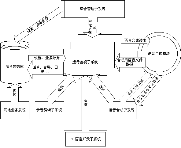 運行系統(tǒng)服務(wù)程序,向客戶提供IVR服務(wù),上面安裝語音卡,負責(zé)和語音卡的接口,各通道的狀態(tài)顯示等。上面安裝綜合管理子系統(tǒng)、CTL語言開發(fā)子系統(tǒng)、語音合成子系統(tǒng)和錄音編輯子系統(tǒng)。
