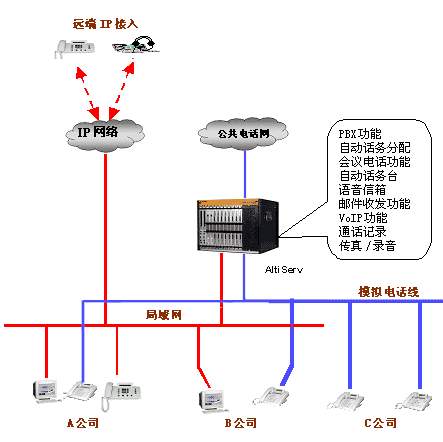 | 多個(gè)小型辦公室共享一個(gè)電話系統(tǒng)或局域網(wǎng)是一個(gè)比較經(jīng)濟(jì)選擇,現(xiàn)在很多辦公樓也是采用這種方式為大樓里的辦公室提供通訊或數(shù)據(jù)服務(wù),大大減少了租戶的通訊的投資。但是采用傳統(tǒng)的交換機(jī)也帶來很多不便。如只能有一個(gè)總機(jī),撥入的電話不知道是找哪個(gè)公司的,既增加接線員的工作,又不利樹立公司的形象。如何公平地向共用交換機(jī)的辦公室的收取電話費(fèi)也是個(gè)解決不了的問題,因?yàn)闊o法記錄和統(tǒng)計(jì)每個(gè)辦公室的撥出的電話量。 但是采用奧迪堅(jiān)的ALTISERV,這些問題很自然地就解決了。將每個(gè)辦公室設(shè)成一個(gè)工作組,每個(gè)工作組可以設(shè)置特定的撥入撥出電話市話號碼,對總機(jī)而言,來電時(shí)的桌面顯示公司名,或者通過多個(gè)自動(dòng)話務(wù)臺(tái)直接轉(zhuǎn)入工作組。 對于撥出電話,只能通過事先設(shè)定電話進(jìn)入市話網(wǎng)。這樣,這個(gè)電話的全部費(fèi)用都由這個(gè)公司。 此外,共享的辦公室及其員工都可以使用ALTISERV提供的全部功能,就好象這個(gè)辦公室建了一個(gè)專門的網(wǎng)絡(luò)電話系統(tǒng)一樣。 接線圖如下: |