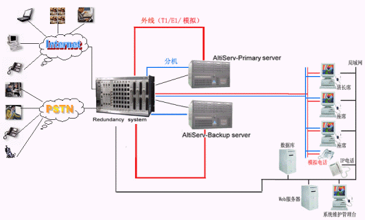 奧迪堅通訊系統(tǒng)有限公司作為CTI通訊平臺的提供商,在技術(shù)上不斷創(chuàng)新,對產(chǎn)品精益求精,尤其體現(xiàn)在對系統(tǒng)的運行安全性的要求上,為了防止電信接入設(shè)備或者企業(yè)網(wǎng)絡(luò)出現(xiàn)故障而造成的呼叫中心服務(wù)中斷,奧迪堅呼叫中心系統(tǒng)提供安全保護冗余切換系統(tǒng),來保障呼叫中心在意外情況下的正常工作,該安全冗余切換系統(tǒng)通過對電源、T1/E1、模擬trunk、分機座席、以及各種網(wǎng)絡(luò)鏈路串口等備份切換來實現(xiàn)可靠的運行。除此之外,奧迪堅系統(tǒng)本身也提供強大的安全保障,由于采用先進(jìn)IP內(nèi)核一體化設(shè)計,集傳統(tǒng)PBX、CTI服務(wù)器、IVR、ACD、Recording、FAX等眾多設(shè)備于一體,這樣有效的避免了因為外掛設(shè)備過多以及設(shè)備供應(yīng)商的不同而存在的兼容性的問題,從而降低了給呼叫中心系統(tǒng)帶來的的不穩(wěn)定的安全隱患。在系統(tǒng)之外依靠安全保護冗余切換系統(tǒng),可以實現(xiàn)外線、分機、以及各種鏈路接口的雙倍安全運行。如上圖所示:兩臺奧迪堅的呼叫中心服務(wù)器和奧迪堅安全冗余切換系統(tǒng)構(gòu)成呼叫中心熱備份系統(tǒng),在兩臺服務(wù)器中安裝所有的呼叫中心功能模塊。通常情況下由主呼叫中心服務(wù)器提供系統(tǒng)的正常運行,備份服務(wù)器通過安全保護冗余切換系統(tǒng)的服務(wù)監(jiān)測模塊來監(jiān)測主服務(wù)器的各項設(shè)備和鏈路的使用情況,當(dāng)主服務(wù)器遭遇突發(fā)故障不能繼續(xù)工作時,系統(tǒng)馬上實施自動切換,就會通過安全保護冗余切換系統(tǒng)將系統(tǒng)切換到備份的呼叫中心系統(tǒng)上來,此鏈路可以是數(shù)據(jù)、語音、網(wǎng)絡(luò)、串口等。當(dāng)安全保護冗余切換系統(tǒng)自身出現(xiàn)斷電或者其他故障時,所有鏈路均保持正常工作狀態(tài)。