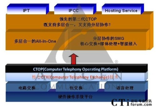 Telephony Operating Platform)平臺(tái),在CTOP平臺(tái)設(shè)計(jì)中引入了核心交換、媒體處理與智能接入三層應(yīng)用架構(gòu)。在CTOP平臺(tái)上構(gòu)建呼叫中心系統(tǒng),既可兼容既有多層合一的All-In-One模式,也可采用分層協(xié)作的構(gòu)建模式,并適用于從小到大各種規(guī)模的呼叫中心!
