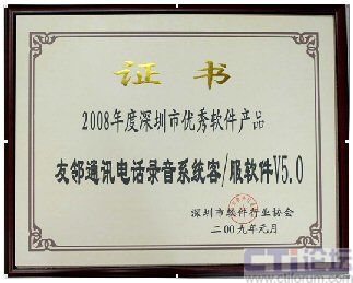 2009年1月,友鄰?fù)ㄓ嶋娫?huà)錄音系統(tǒng)客/服軟件V5.0 榮獲由深圳市軟件行業(yè)協(xié)會(huì)頒發(fā)的“2008年度深圳市優(yōu)秀軟件產(chǎn)品”榮譽(yù)證書(shū)!2008年度深圳市優(yōu)秀軟件產(chǎn)品”的評(píng)選是深圳市軟件行業(yè)協(xié)會(huì)在全市范圍內(nèi)舉辦的軟件產(chǎn)品推優(yōu)活動(dòng),經(jīng)過(guò)了企業(yè)申報(bào)、技術(shù)資料審核、專(zhuān)家評(píng)審等等幾大嚴(yán)格篩選程序。