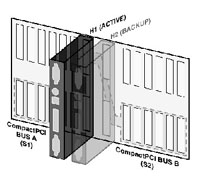 服務器刀片間的熱備份 背板的各種總線往往會分成兩段,每段有不同的SBC控制。在背板上存在兩個特殊槽位,在這些槽位上的SBC同時連接到這兩段總線上,正常狀態(tài)下一個活動的SBC在控制兩段總線和總線上的設備,另一個SBC處在備份狀態(tài),如果活動的SBC出現(xiàn)故障,備份SBC會接管兩段總線和應用。參見圖2。