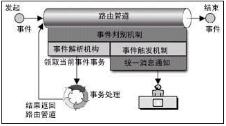 在路由管道中流轉(zhuǎn)著加載了業(yè)務(wù)的工作流事件。事件按照事先定義的路由規(guī)則流轉(zhuǎn),事件的路由規(guī)則定義了事件在路由管道中可以?康摹罢九_”,同時定義了事件到達(dá)“站臺”時可以領(lǐng)取并處理加載在事件上的業(yè)務(wù)的角色。事件從始發(fā)站臺進(jìn)入路由管道,經(jīng)過一個或多個中間站臺,最后到達(dá)終點(diǎn)站。事件每?恳粋站臺,相關(guān)人員領(lǐng)取事務(wù),并進(jìn)行處理后重新裝載事務(wù),觸發(fā)事件向下一個站臺流轉(zhuǎn),除非事件已經(jīng)到達(dá)終點(diǎn)站。