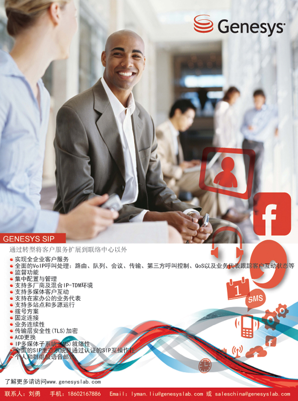 Genesys是世界領先的客戶服務和聯絡中心軟件供應商------百分百致力于改善客戶體驗,讓人們擺脫糟糕的客戶服務。Genesys以獨特的定位,幫助全球80個國家的2000多家公司,整合員工資源,企業(yè)視角和客戶渠道,來驅動創(chuàng)新的客戶溝通方式。Genesys 軟件每天引導1 億多名客戶進行交互,從聯絡中心到后臺辦公室,提升整體客戶體驗。Genesys 軟件還能夠幫助企業(yè)避免客戶不滿、提高企業(yè)效率、促進業(yè)務創(chuàng)新,并有效利用資源。