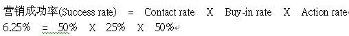 rate(接觸率,能夠聯(lián)系到客戶(hù)的比率), Buy-in rate(接受率,聯(lián)系到的客戶(hù)里面表達(dá)有興趣的比率), Action rate(成交率,表達(dá)有興趣的客戶(hù)里面真正付錢(qián)購(gòu)買(mǎi)的比率)。一般而言,接觸率能達(dá)到50%算是不錯(cuò)的名單,而接受率能達(dá)到25%算是產(chǎn)品、名單選擇登對(duì),銷(xiāo)售技巧也到位,最后臨門(mén)一腳的成交率應(yīng)該要能到50%算是達(dá)標(biāo)了。以下列公式來(lái)表達(dá)(標(biāo)準(zhǔn)以上述的比率套用):