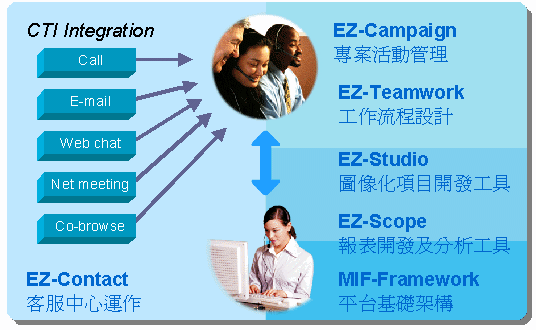 EZactor客服中心CRM平臺系統(tǒng),以MIF-Framework模塊為平臺基礎(chǔ)架構(gòu),在該強大之穩(wěn)定架構(gòu)上以EZ-Contact模塊作為客服中心運作核心,另外延伸有EZ-Campaign、EZ-Teamwork、EZ-Scope、EZ-Studio等模塊,分別提供營銷活動管理、工作流程設(shè)計、數(shù)據(jù)統(tǒng)計與分析、項目開發(fā)工具等功能,全面滿足客服中心運行之需要。