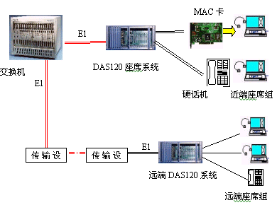 見下圖:DAS120主機(jī)通過4個(gè)E1接口與交換機(jī)直接連接,可方便地實(shí)現(xiàn)本地座席接入。遠(yuǎn)端分布式接入則需要通過傳輸設(shè)備,它們可為光纖,微波,HDSL等。終端可為座席卡和電話機(jī)。