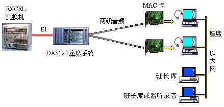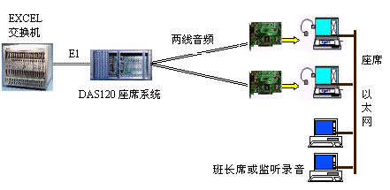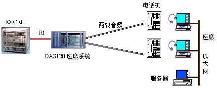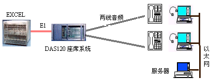 因?yàn)镋XCEL交換機(jī)不能提供模擬接口。DAS120的出現(xiàn)很好地彌補(bǔ)了其不足。它與EXCEL交換機(jī)采用4個(gè)E1連接,可以簡潔實(shí)現(xiàn)PCM信號(hào)轉(zhuǎn)模擬信號(hào)引出到座席。E1接口的信令可選配為隨路信令CAS和透明通道Clear