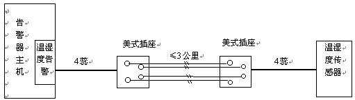 溫、濕度傳感器通過四蕊電話線與告警器主機(jī)相連。兩者距離很近時,將傳感器接線插入主機(jī)溫、濕度告警接口即可。若距離不夠長時,可按上圖一對一的加長連線,連線距離可達(dá)3公里。